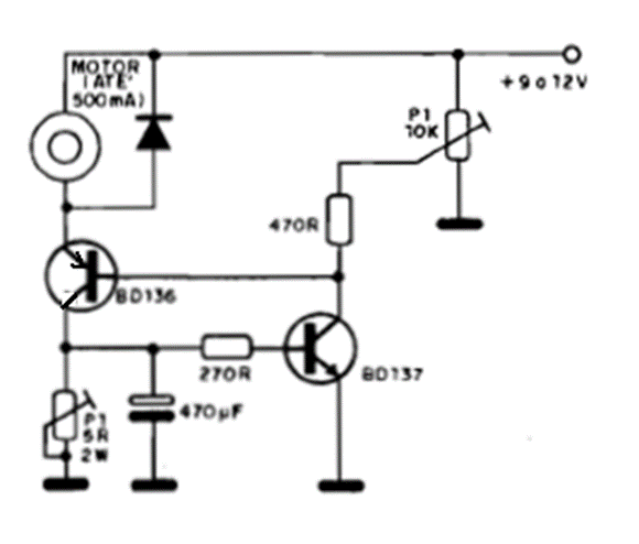 This type of circuit is widely used in old cassette recorders and tape players, regulating the speed of a direct current motor up to 500 mA. It is a completely analog circuit that senses the current in the motor to maintain constant speed. The two adjustments are made on the trimpots and the BD137 must be mounted on a heat radiator. The supply voltage ranges from 9 to 12 V. This circuit can be used as an auxiliary shield to maintain constant the speed of a motor controlled by a microcontroller.