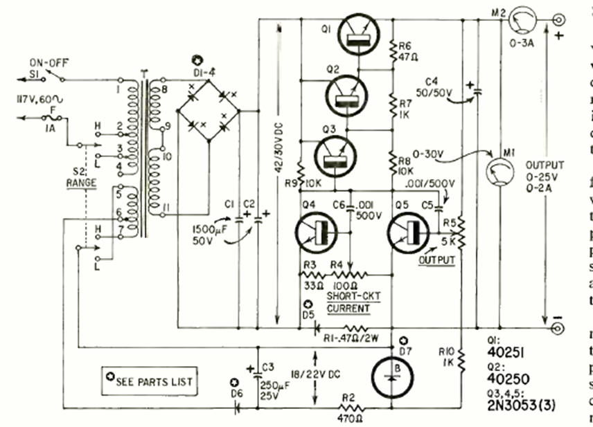 This circuit with silicon transistors at the time was found in the Radio Electronics magazine of June 19666. Transistor Q1 must be equipped with a good heat sink. The magazine described its complete assembly in an article.