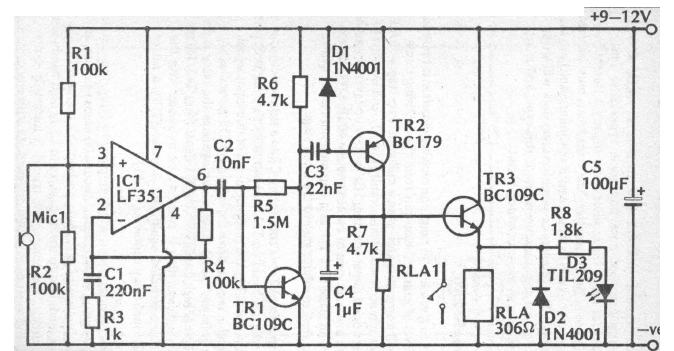 This is the receiver for the previous transmitter. The microphone is of the high impedance ultrasonic type. The circuit activates a relay. The operational amplifier supports equivalent.