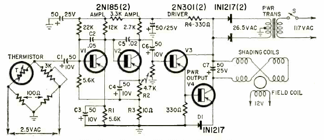 This sophisticated transistorized motor control appeared in the April 1952 Radio Electronics magazine. By this time transistors were already appearing in circuits in large numbers in technical magazines. The circuit is relatively low power.