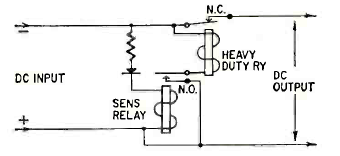 This relay circuit protects against accidental inversion of input polarity. The circuit was published in Radio Electronics magazine of October 1961. The relay is according to the input voltage.