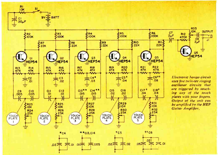 The article that teaches the assembly is from a Radio Electronics issue from July 1969. The circuit can be easily implemented with modern transistors such as the BC548. The output should be connected to an amplifier.