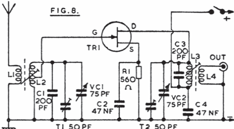 This circuit is intended for amplification of signals in the range of 1.8 to 20 MHz. The transistor can be a BF245 or MPF102. We found it in old English documentation.