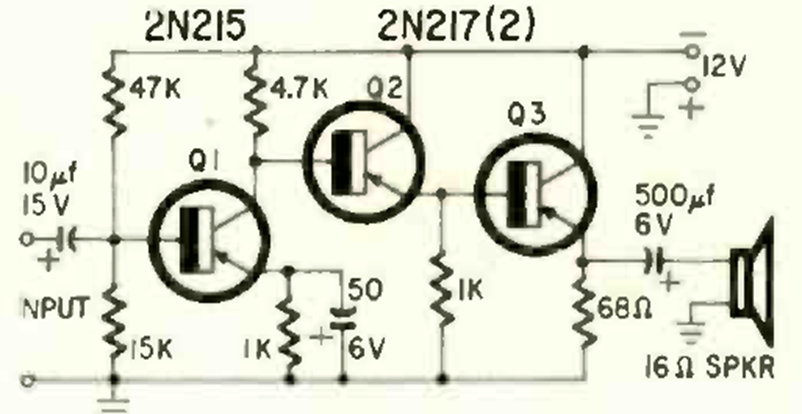 This transformerless 16-ohm speaker circuit was found in a Radio Electronics from October 1963. The circuit is powered by 12 V and the gain is 50 dB.