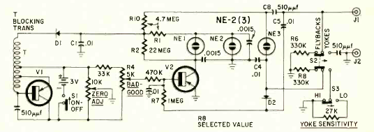 This circuit appeared in a Radio Electronics magazine in March 1962. The circuit uses two transistors of the time and consists of an oscillator. The indication is through neon lamps.
