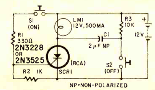 This circuit was found in the June 1969 Radio Electronics magazine. Unlike the previous one, the shutdown is done by shorting the SCR through a capacitor.