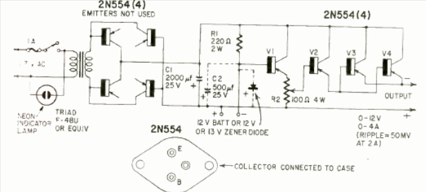 Using power transistors of the time, this source was published in Radio Electronics magazine in April 1959. The 4 A source has a voltage of 12 to 13 V at its maximum.
