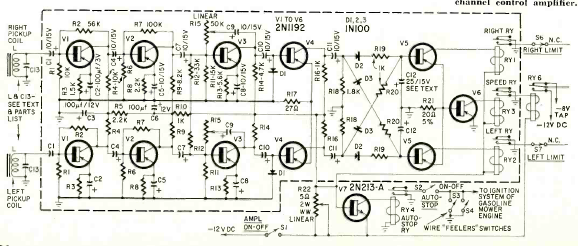 This is the circuit of a “follow the line” type robot with inductive sensors published in Radio Electronics magazine in April 1961. The robot was a lawn mower, a novelty at the time.