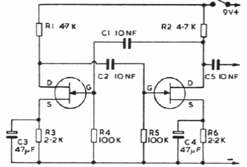 This circuit generates signals whose frequency depends on C1 and C2. JFETs are common types like BF245 or MPF102.