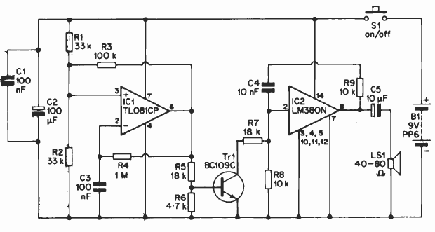 This power oscillator uses an LM380 amplifier. We found it in old English documentation. The C3 and C4 components can be changed to change the modulation and sound.