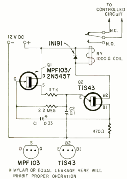 This circuit was found in the June 1969 issue of Radio Electronics magazine. The circuit uses a relay triggered by a FET and Unijunction transistor circuit. The timing is dependent on the capacitor.
