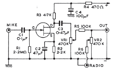 This circuit is from an old English documentation. It is intended for coupling a microphone to the modulation input of a transmitter. Any JFET can be used.
