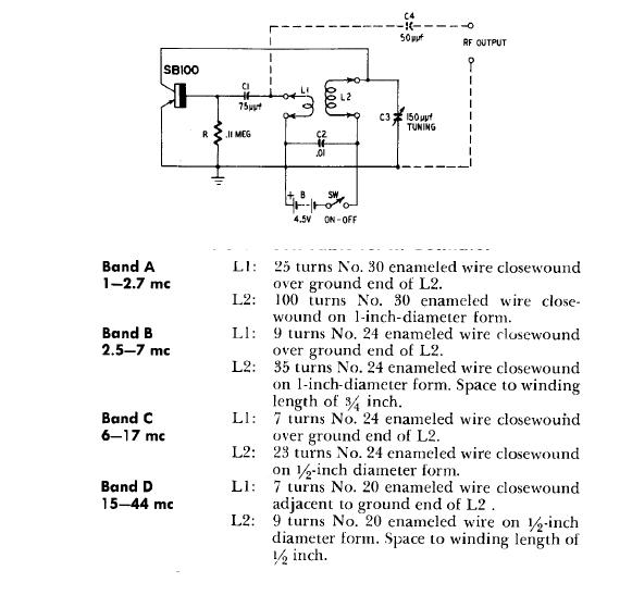 This circuit supports several sets of coils and can oscillate from 1 to 44 MHz. The transistor is an old special type, as the circuit was found in documentation from the 60s.
