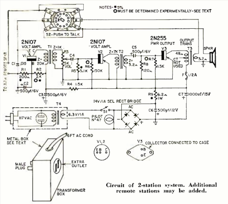 This circuit was found in Radio Electronics magazine from June 1958. The maximum distance depends on cable losses. More stations can be added.