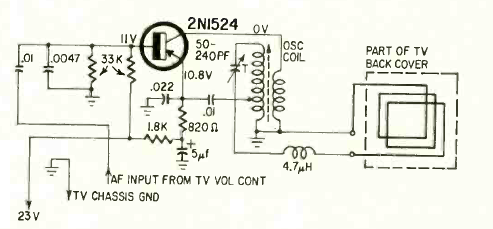 The idea of this circuit is to use an AM radio with headphones to receive sound signals transmitted from a television. So we have a wireless headset. The circuit is from a Radio Electronics from June 1963.