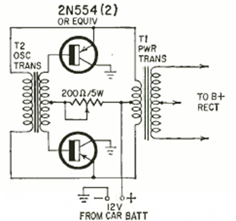 The original purpose of this 1963’ circuit from a magazine is to replace the mechanical vibrators used to power valves in the car. Transistors are power types of the time, which must be equipped with heat sinks. The output voltage depends on the transformer.