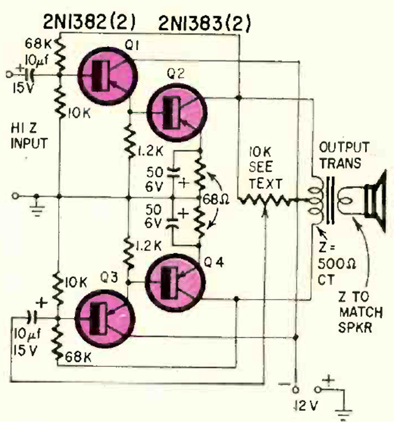 We found this circuit in a Radio Electronics from October 1963. The circuit uses an output transformer with a center tap. The trimpot is adjusted for higher gain and lower quiescent current.