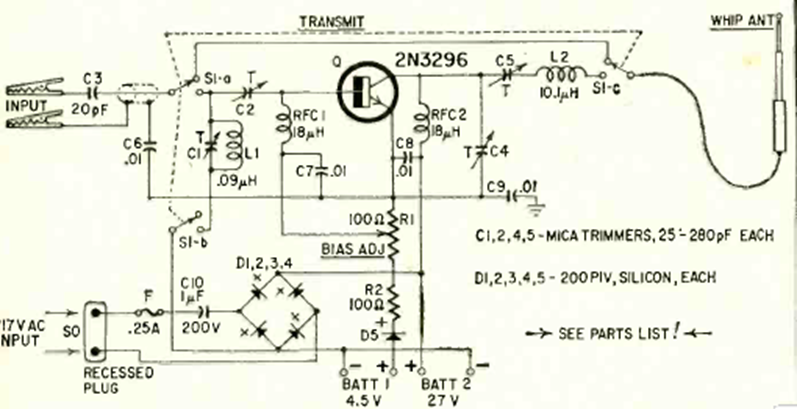 The purpose of this circuit is to increase the power and range of a small walkie talkie. The circuit is from a Radio Electronics from March 1967. The RF transistor is from the time. Note the use of a 27 V battery, which is uncommon these days.
