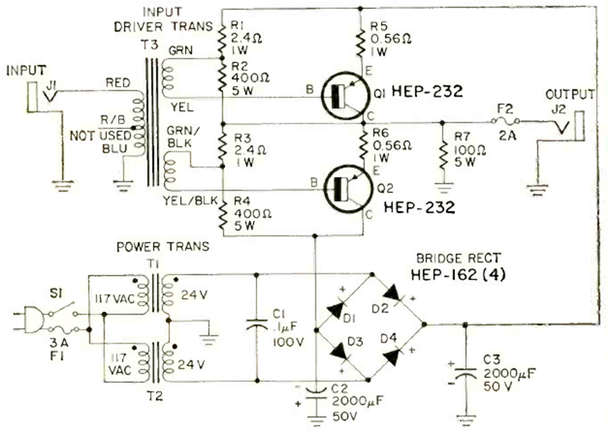 This PNP transistor power stage was found in the May 1969 issue of Radio Electronics magazine. The circuit uses a transformer for excitation and requires 10W input for full output power.