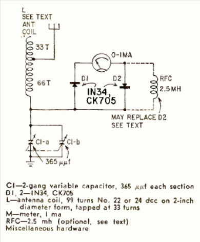 This circuit is suitable for experiments with self-powered radios to verify the available signal strength. The instrument can be a higher sensitivity type or a multimeter. The circuit is from a Radio Electronics from April 1958.