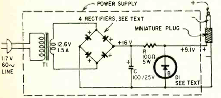 This circuit is regulated by zener and provides a voltage of 9 V. The circuit is from a Radio Electronics from November 1965. The current depends on the transformer and on the dissipation of the zener together with the value of the resistor R.