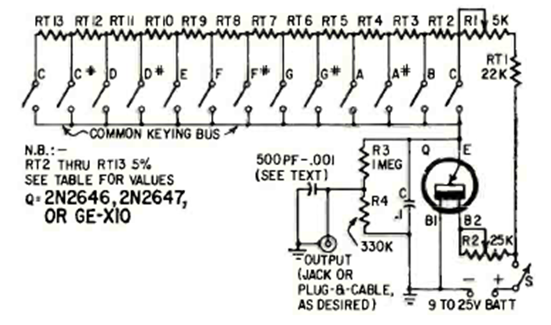 This simple circuit with a unijunction transistor at the time appeared in Radio Electronics magazine in June 1966. The tuning depends on the resistors. The circuit must be connected to an audio amplifier.