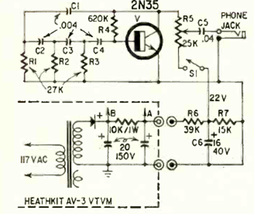 This bench signal injector, powered by the power grid, was published in Radio Electronics magazine in April 1963. The circuit uses only 1 transistor generating a low frequency sinusoidal signal.