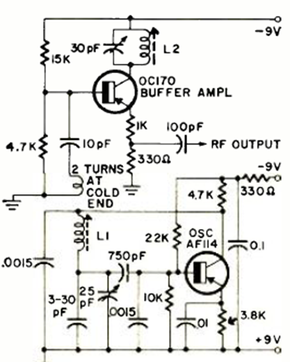 This interesting oscillator configuration was found in the October 1960 issue of Radio Electronics magazine. Frequency depends on L1 and the adjustable 750 pF capacitor. Average operating frequency is 21 MHz.