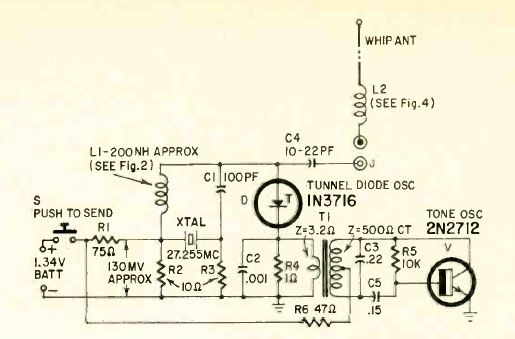 This is a version of the previous circuit that includes a tone modulator based on a Hartley oscillator. The short-range circuit was published in the June 1953 Radio Electronics.