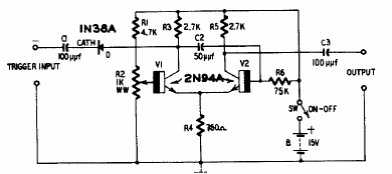 This monostable or one-shot circuit was found in an American publication from the 60's. Transistors are germanium types of the time.