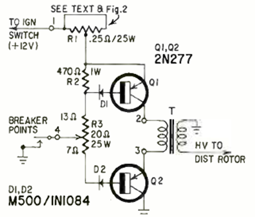 This assisted ignition circuit (which reduces the spark current) dates to the time when cars had spark plugs. The transistor performed the switching with better performance. The circuit is from a Radio Electronics from July 1963.