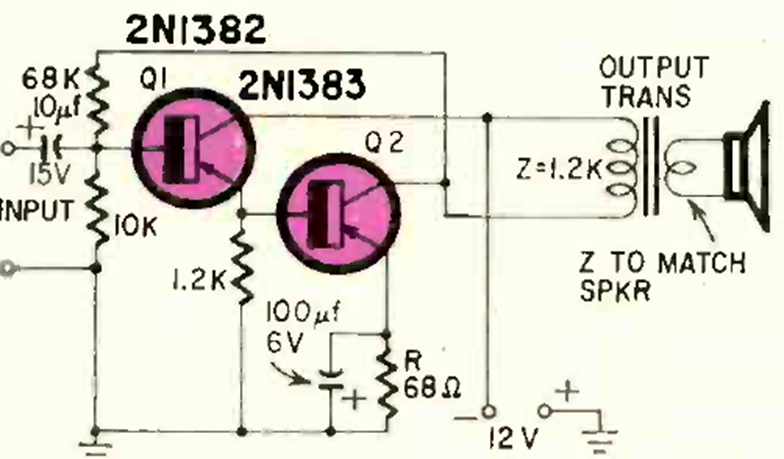 This direct coupled circuit operates in class AB with good gain. The circuit is powered by 12 V. We found it in a Radio Electronics from October 1963.