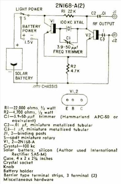 This solar oscillator that works as a frequency standard was found in Radio Electronics magazine from February 1959. The circuit is powered by a cell from the time.