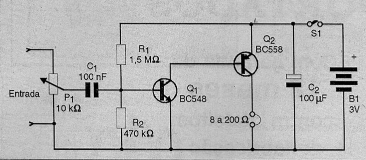 We can use this amplifier with low impedance headphones with good performance. Possible applications for this circuit range from signal trackers and experimental radios to a simple stethoscope. The resistors are 1/8 W and power can be supplied with just two small batteries.