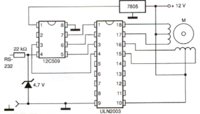 The circuit shown in the figure makes it possible to control a stepper motor via a PC's serial port (RS-232). In this application we use the ULN2803 integrated circuit for power control with the capacity to supply currents of up to 500 mA to the controlled motor. The 7805 integrated circuit reduces the 12 V voltage of the motor supply to the 4 V necessary for the logic formed by the 12C509 integrated circuit. The 4V7 x 400 mW zener diode serves as a filter to divert any higher voltage pulses that are on the data line and could cause malfunctions in the circuit.