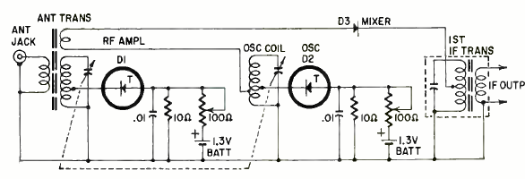 In the figure we have an input circuit for a receiver in which conventional transistors were replaced by tunnel diodes. The circuit is from a Radio Electronics from November 1962.