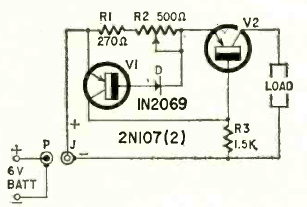 This circuit with two transistors was found in Radio Electronics magazine from March 1963. The V2 transistor must be a power transistor mounted on a heat sink.