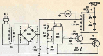 This circuit generates a high negative voltage responsible to produce ions in a tip electrode. The circuit is from a Popular Electronics from the 90's. The transformer could be an ignition coil.