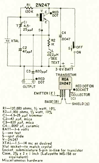 This circuit of various uses on the bench was found in Radio Electronics magazine from January 1960. The transistor is a type of RF at the time. Power is via battery.