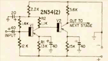 This direct-coupled two-transistor amplifier stage was published in the September 1958 Radio Electronics magazine. The circuit uses that time transistors.