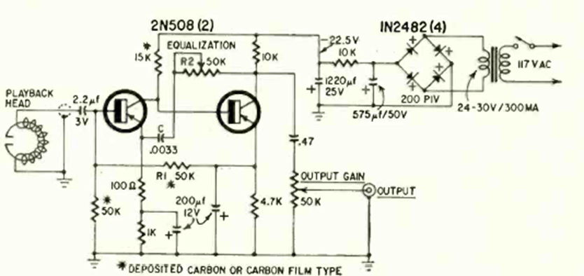 This amplifier for recording heads was found in a Radio Electronics from September 1963. The circuit uses period transistors but can be modified to work with modern transistors.