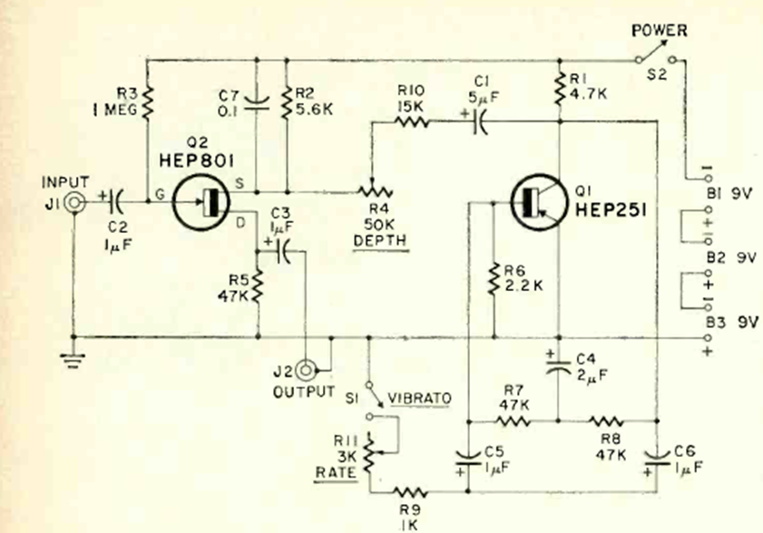 This sound effect circuit was obtained from an article in the April 1969 issue of Radio Electronics magazine. The two transistors are general-purpose types from the time that accept modern-day equivalents. Power is provided by three 9 V batteries.