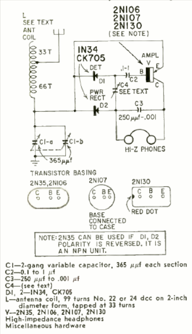 This receiver powered by the signal captured by the antenna (which must be long) was found in Radio Electronics magazine from April 1958. The circuit is for the medium wave band.