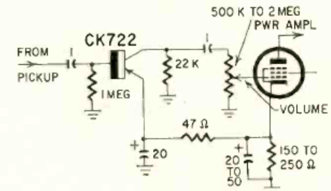 This preamplifier with 1 CK722 transistor was found in Radio Electronics magazine from May 1959. Power comes from the tube circuit itself.