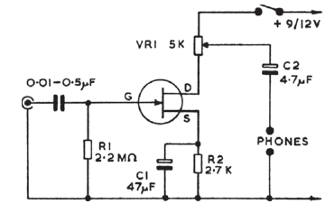 We found this circuit in an old English publication. Any general purpose JFET can be used. The output is for high impedance headphones in this case.