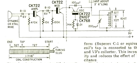 This circuit with the CK722 has a small range. We found it in Radio Electronics magazine from October 1960. Power is supplied by batteries. Coil details are given.