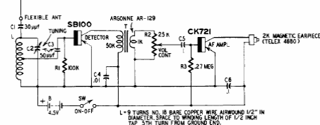 This receiver was found in an American documentation from the 60's. The circuit uses germanium transistors of the time, and the listening is done in a high impedance headset.