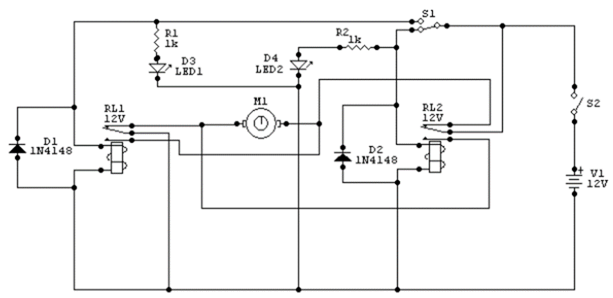 The above project is an H –H bridge drive circuit and can be used to drive DC motors and in the above project we have used the bridge to control the M1 motor. It was sent by reader and collaborator Adriano Muniz Moura. The basis of the circuit is the 12V relays and the power supply is 12V and they are activated in step, serving as a basis for robotics projects and LEDs 1 and 2 serve to indicate the relay that is being activated. Switch S2 powers the entire electronic circuit and switch S1 selects which direction the motor will be turned.