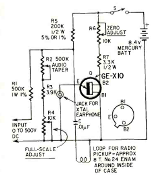 This circuit consists of an audio bridge for voltage measurements. The zero of the bridge is indicated by a crystal phone. The circuit is from a Radio Electronics from November 1965.