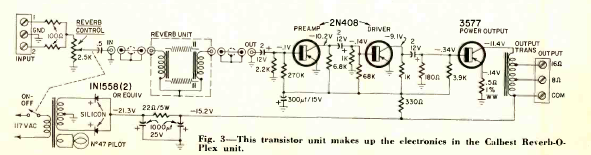 This reverb effect was found in the December 1961 Radio Electronics magazine. It makes use of springs and includes the power supply and power amplifier.